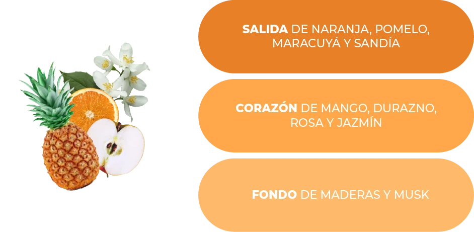 Fragancia vibrante y refrescante con perfil cítrico y frutal.