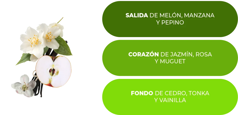 Fragancia vibrante que combina frutas jugosas y flores blancas.
